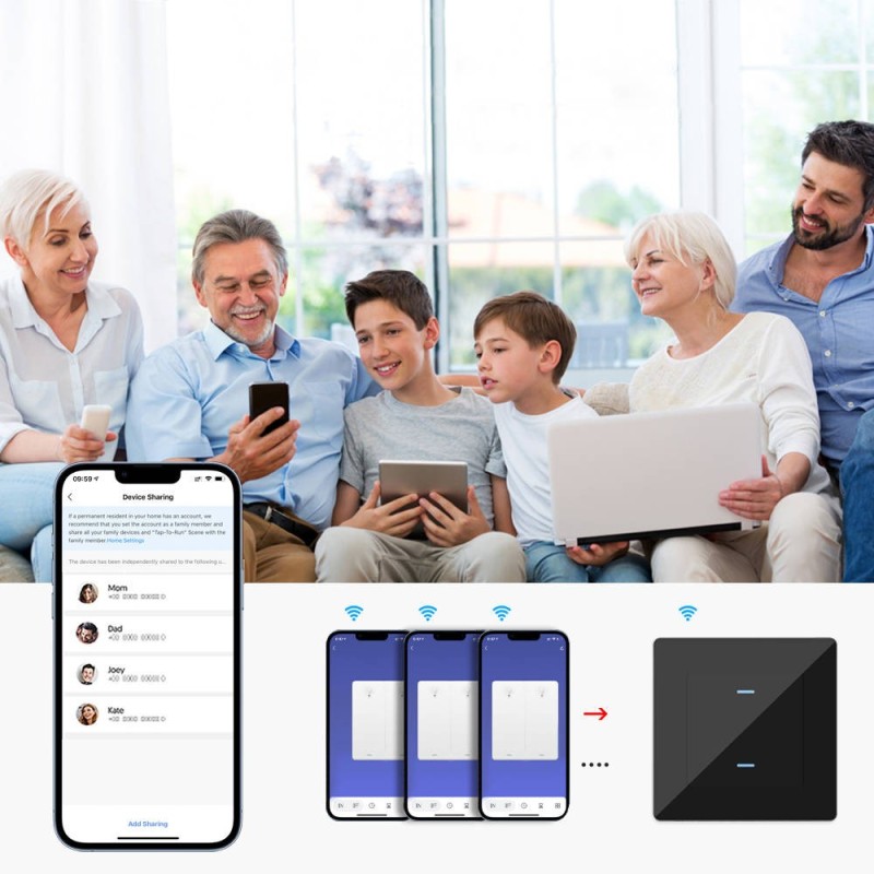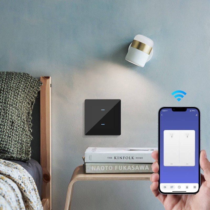Inteliģentais sienas slēdzis ir modulārs slēdzis, kas ļauj lietotājiem attālināti ieslēgt/izslēgt divus savienotus apgaismojumus. ķēdes o jebkuras vietas pasaulē: izmantojot lietojumprogrammu TUYA o jebkuras vietas (Tuya viedā dzīve)