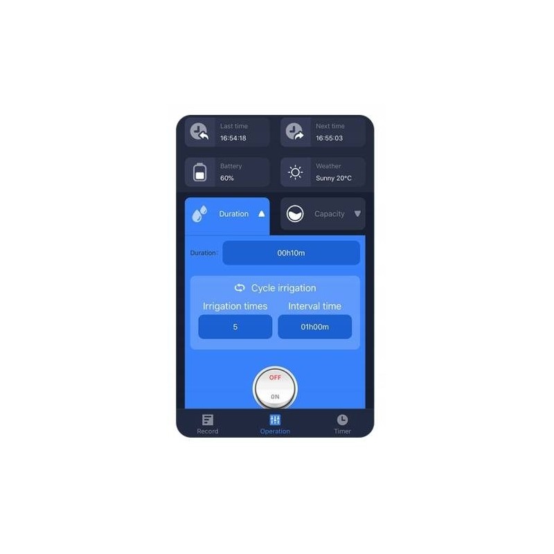 На главном экране в приложении отображается текущая погода, состояние батареи, последний и следующий запланированный полив, установка времени полива, установка количества используемой воды (в литрах), времени полива и количества наливаемой воды