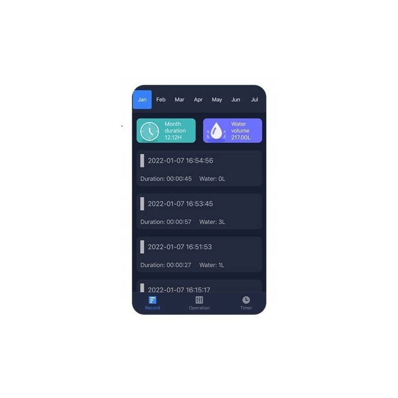 Все общее время использования за месяц суммирует время полива системы. История воды записывает подробную информацию о том, когда был открыт водяной клапан, включая время и количество воды, использованной для каждого полива.