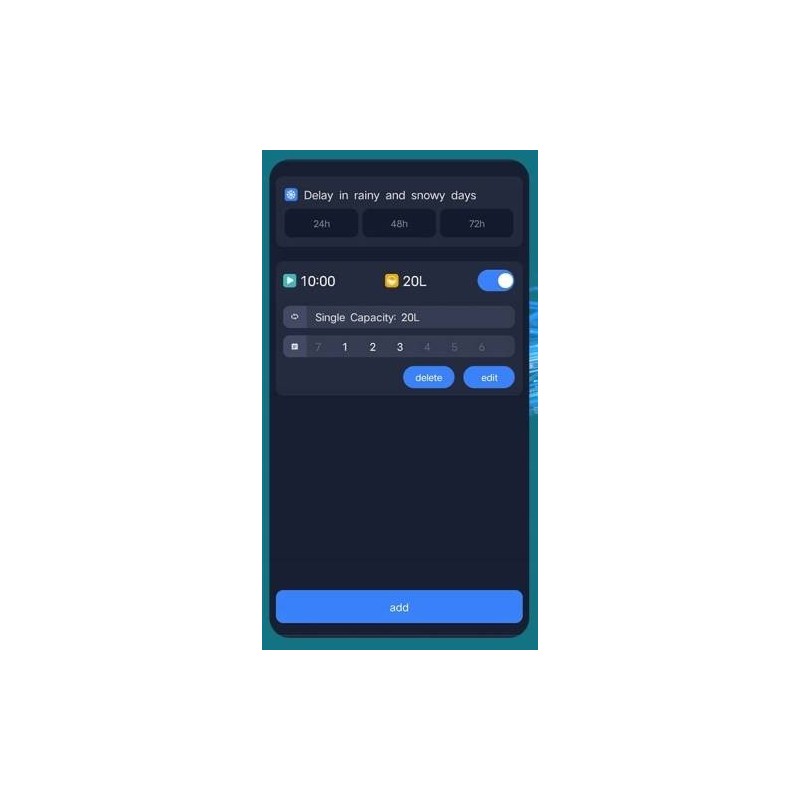 Настройка расписания на уровне устройства (в приложении) Возможность автоматической задержки полива в случае сильного дождя (24ч, 48ч и 72ч), данные с метеостанций рядом с указанным местом установки