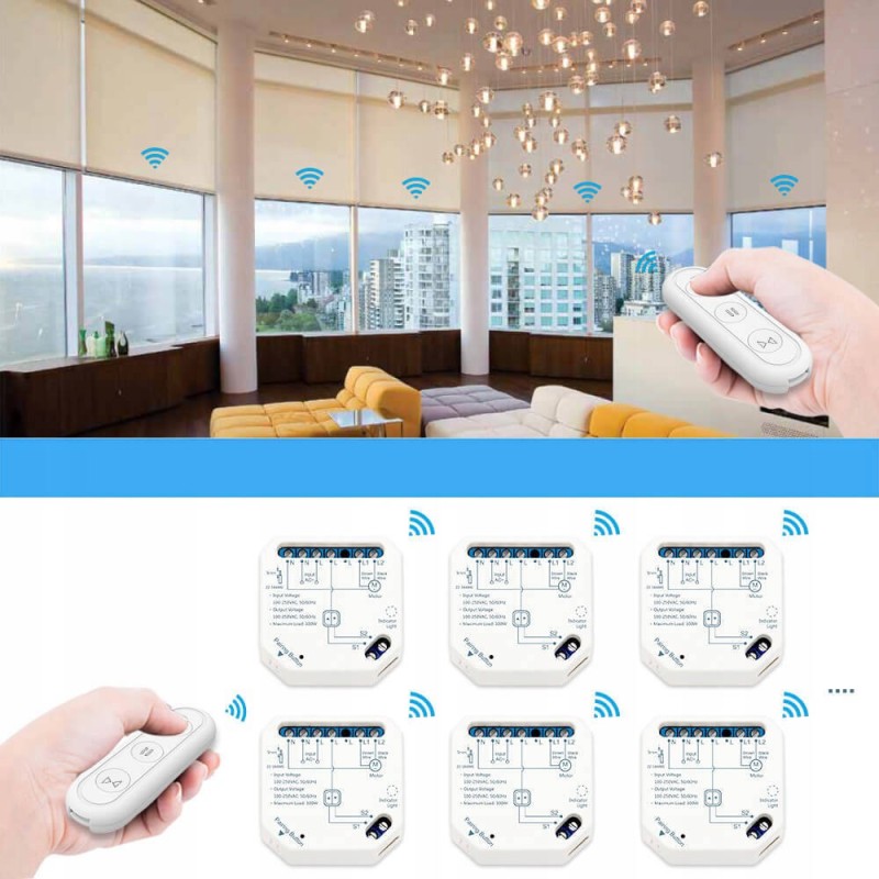 Управление в приложении смартфона /открыть, приостановить, закрыть/. Голосовое управление с помощью Google Home, Amazon Alexa. Используйте пульт дистанционного управления для управления жалюзи/открытие, пауза, закрытие/диапазон управления до 30 м. Встроенный радиочастотный модуль позволяет удаленно управлять жалюзи, даже если Wi-Fi недоступен. Модуль переключателя Wi-Fi третьего поколения с радиочастотным дистанционным управлением.